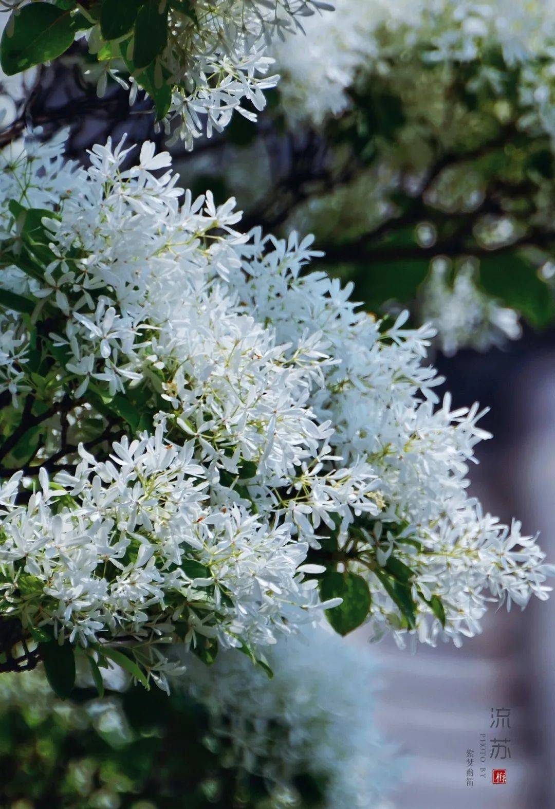流苏,又称四月雪。流苏树因形似古代仕女服饰上的流苏而得名,初夏时节满树白花,远远望去如雪落满树。