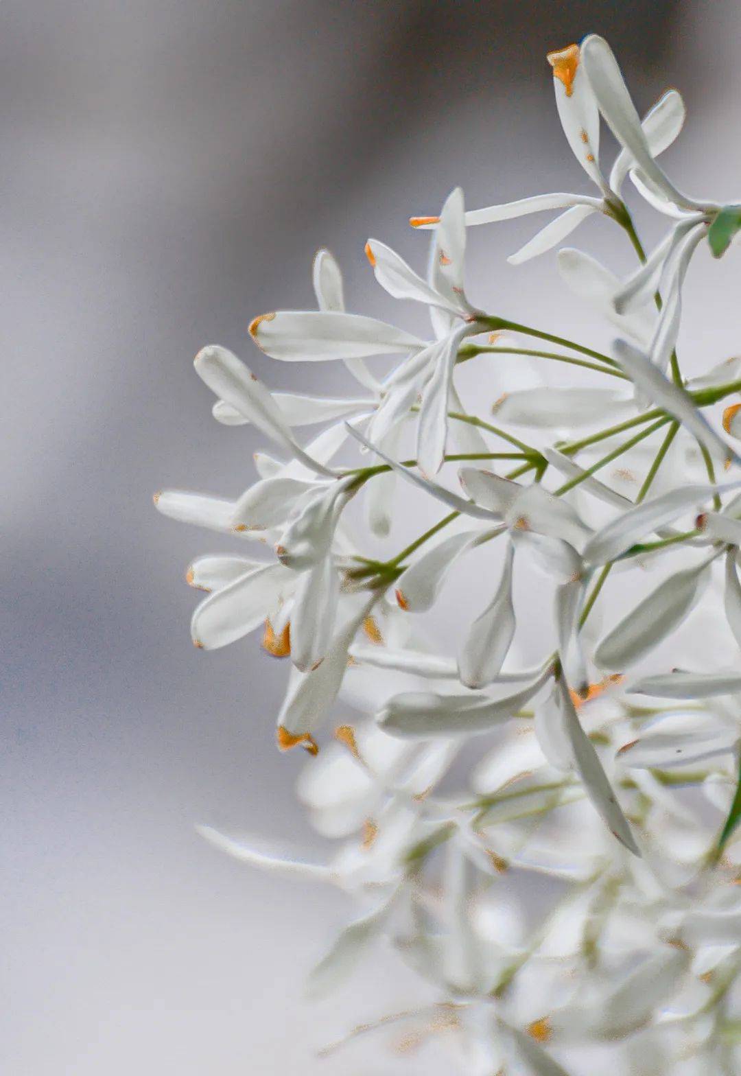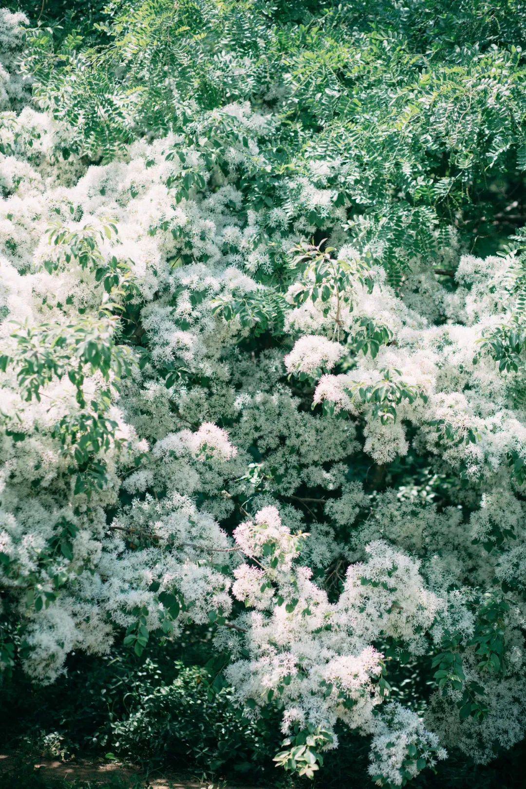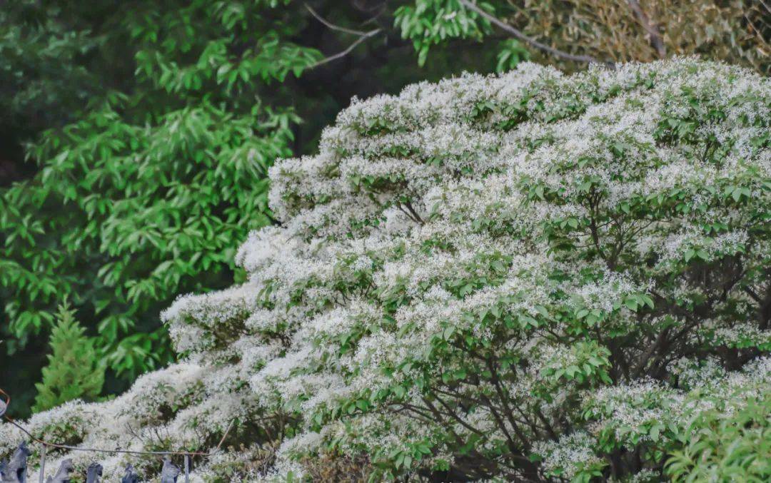 流苏花朵繁密,白得彻底而纯粹,绿叶隐藏在洁白茂密的花朵下,远远看去,整棵流苏树如同被大雪覆盖,压弯了树枝。