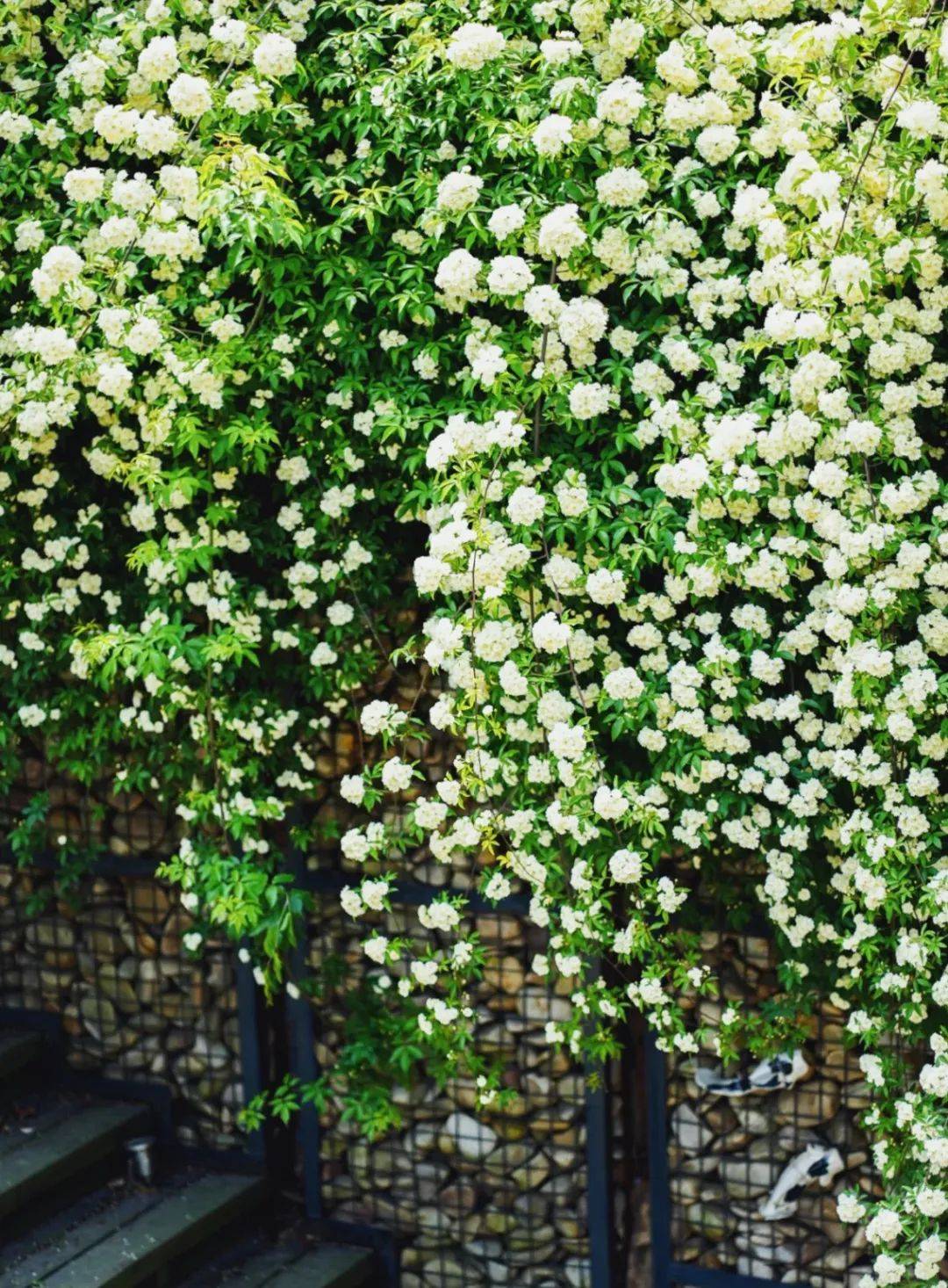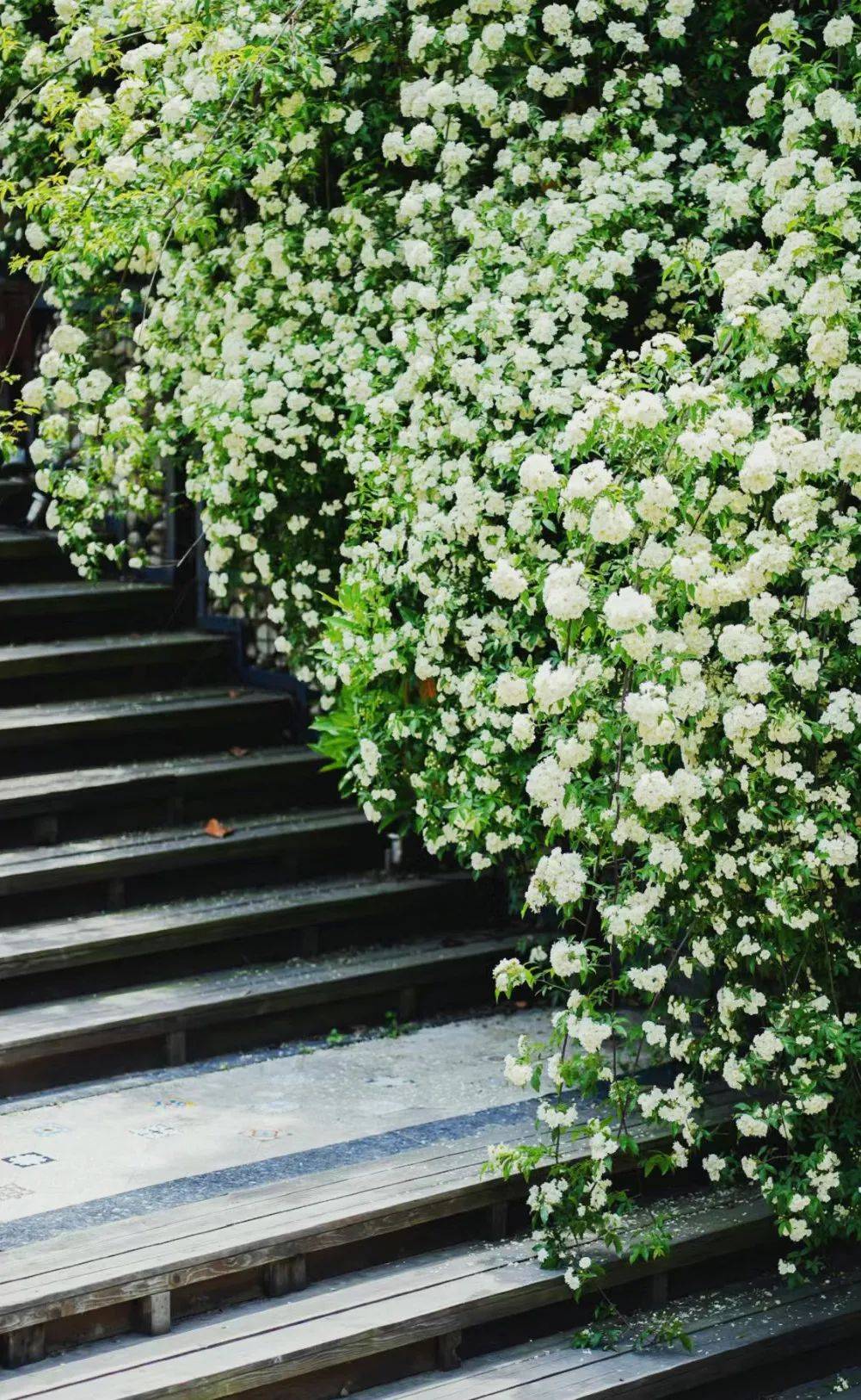 木香花沿着楼梯地势排布,繁密小花从墙头倾斜而出,一直垂到地面,片片花瓣落在楼梯上,似雪花,浪漫极了。