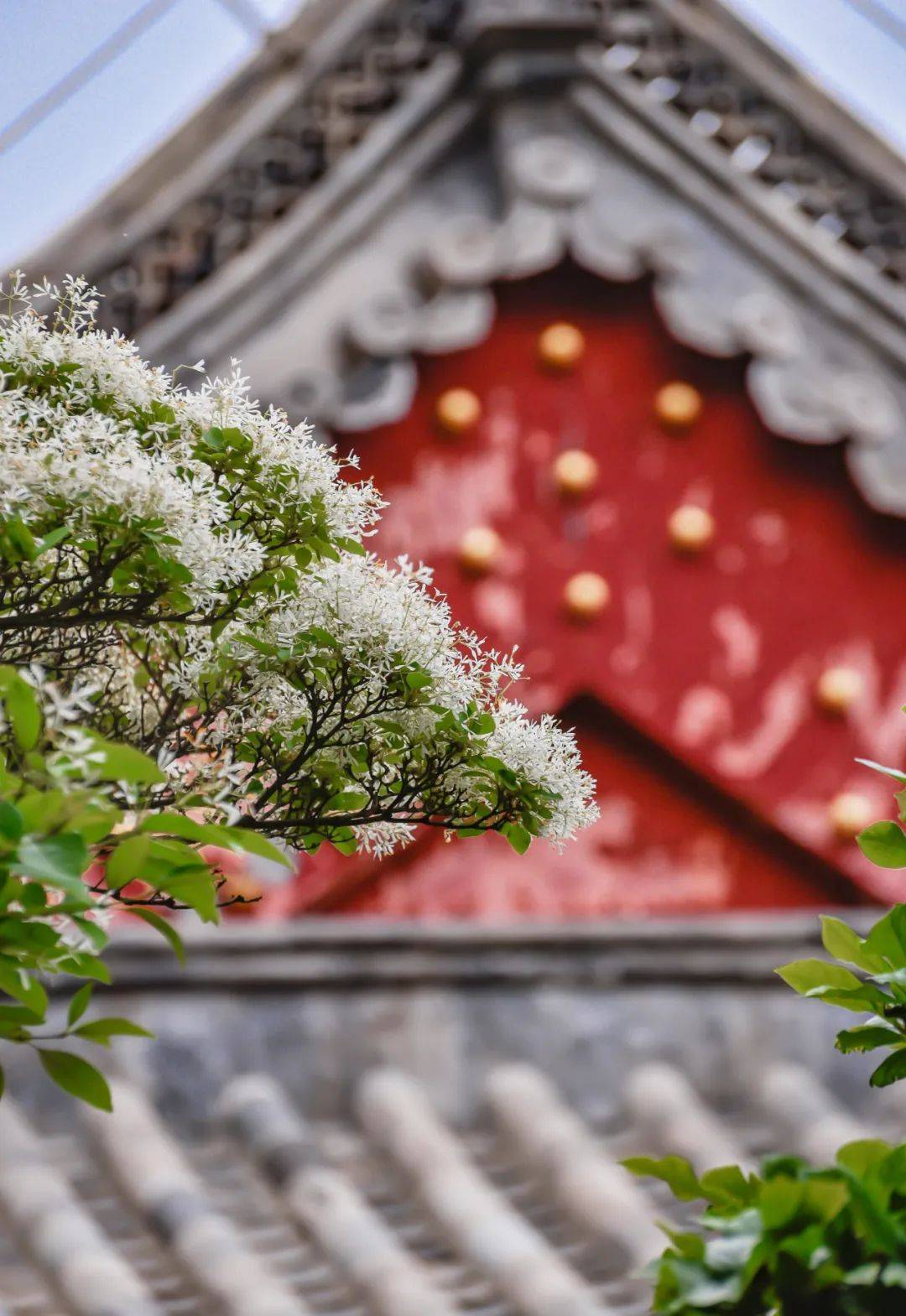 在华严寺三圣殿后,有一棵崂山内最大的百年流苏古树,此时正在盛开,庄严的古寺与洁白的流苏相互映衬,将崂山装点得愈发古朴典雅。