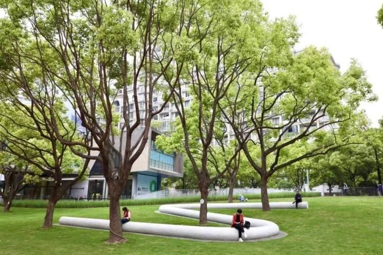 在公园北侧“S”形的地景艺术景观颇为吸睛,市民游客在这里可坐、可躺、可骑,真的是既美观又有趣。据王晔菲介绍,这个装置看似特别,实则动足了脑筋,整个装置的形状正是为了绕开五棵园内本有的高大香樟树,这个装置也成为市民游客休憩赏景的好去处。
