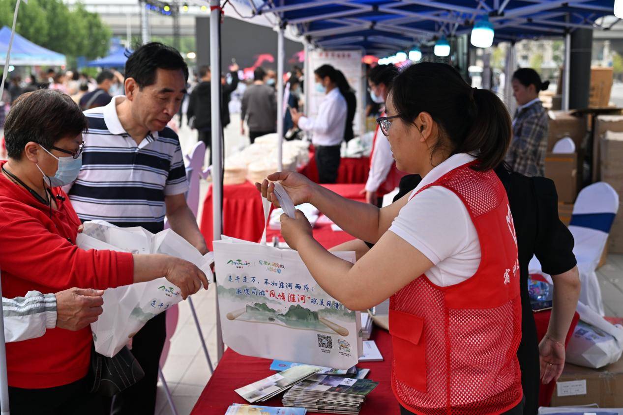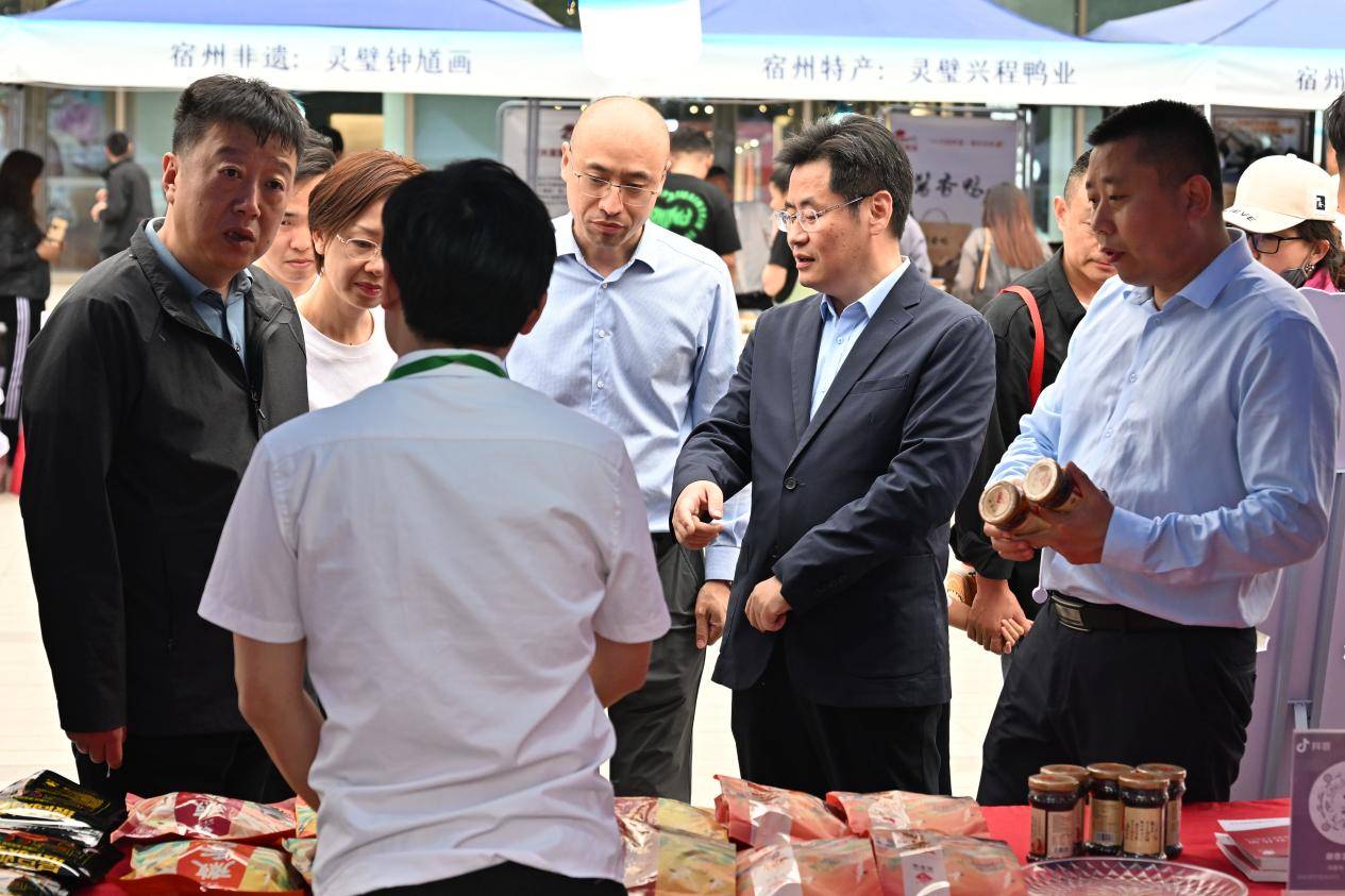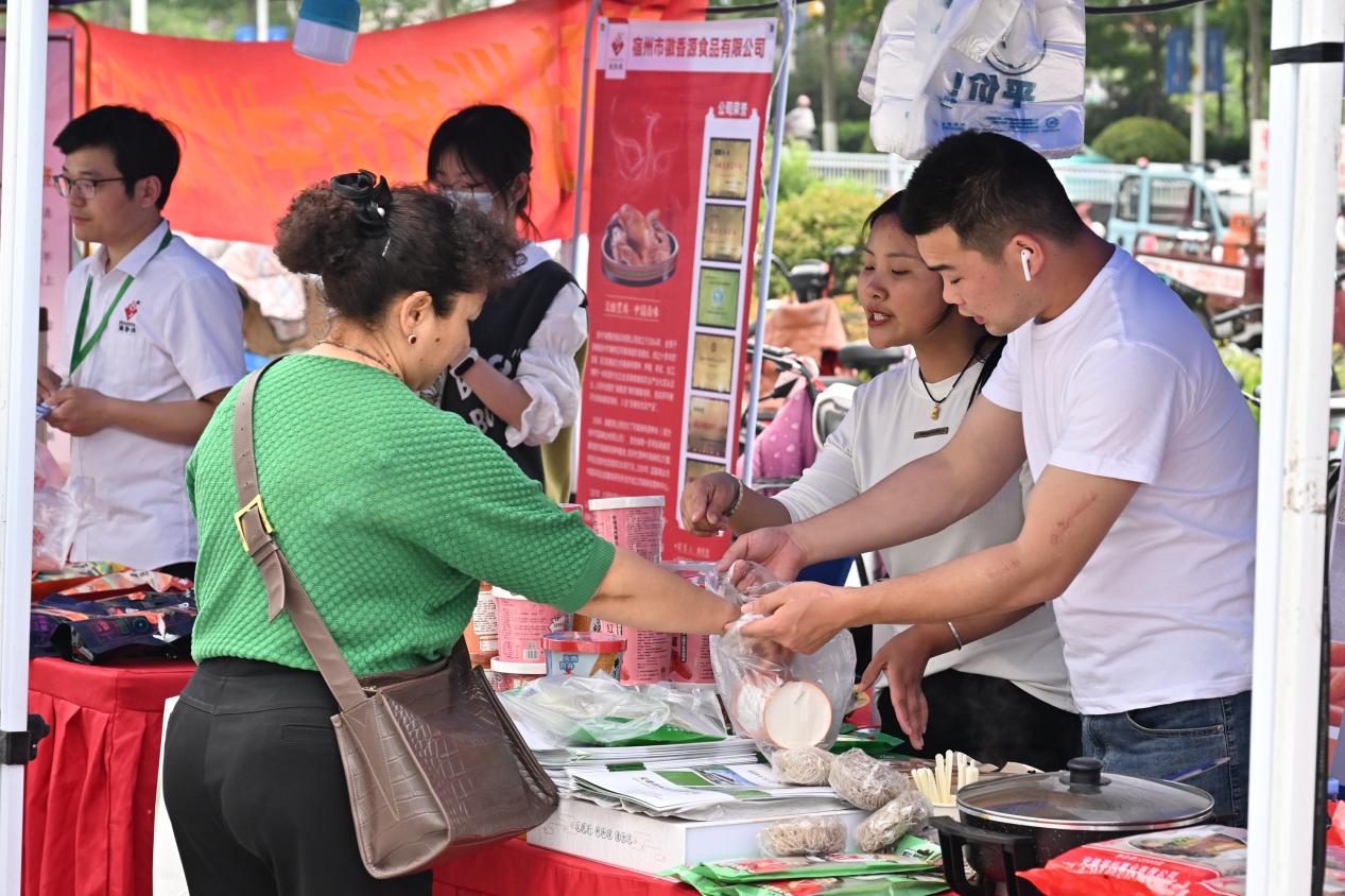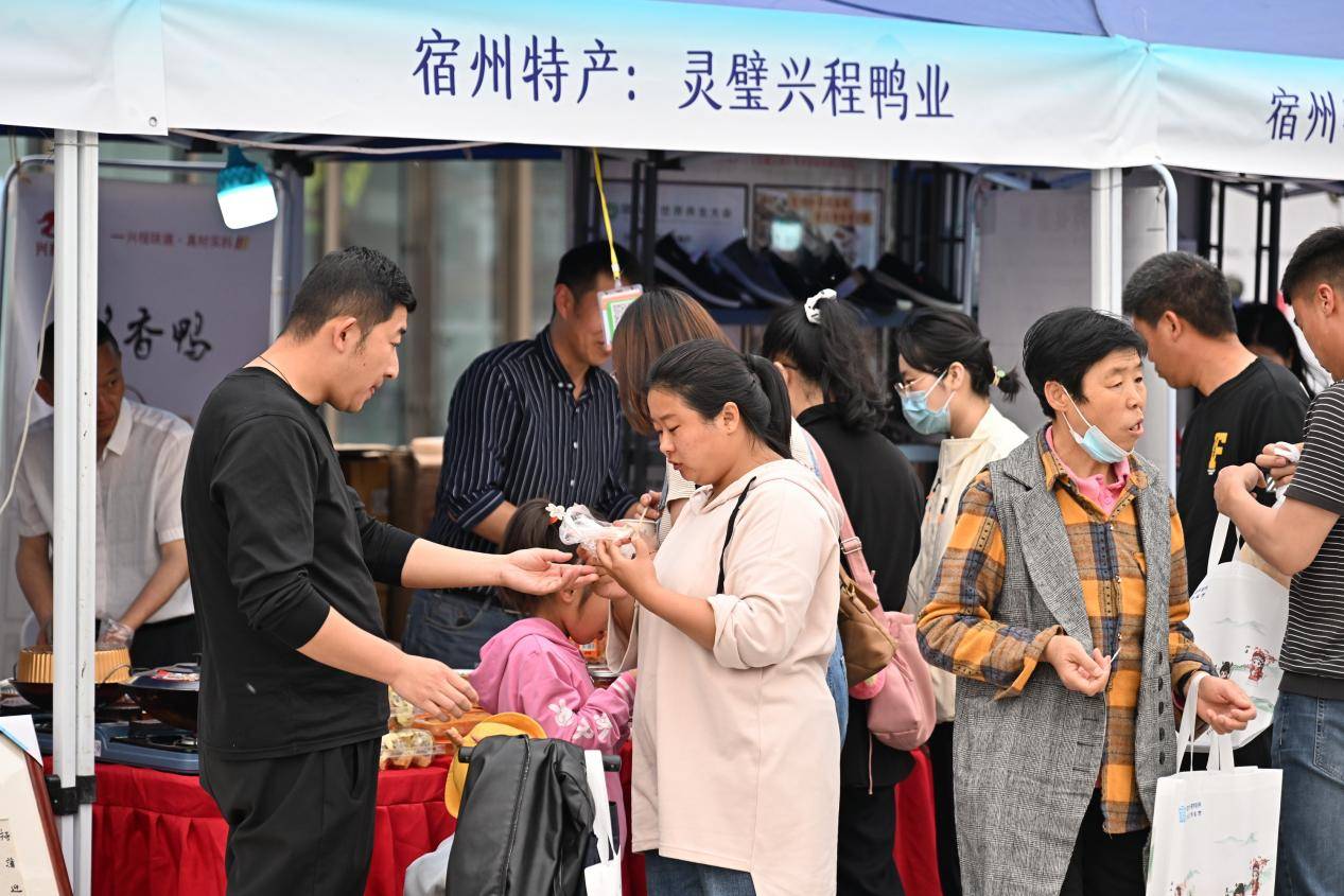 活动现场,还围绕宿州非遗、宿州特产、宿州名菜、宿州汤品、宿州面点等主题,精心设置了特色展区,开展宿州市非遗特色美食展销活动,非遗商品砀山毛笔、萧县书画、埇桥剪纸、灵璧磬石雕刻等琳琅满目,地域美食泗县刘圩大饼、宿州sa汤、符离集烧鸡、萧县羊肉汤、砀山黄桃罐头、灵璧兴程酱香鸭等令人垂涎。现场还免费发放埇桥剪纸扇子、文创美食扑克、有声明信片等宿州礼物和文旅宣传品近千份。广大市民和游客通过互动打卡、鉴赏非遗、品尝美食等方式,沉浸式体验人文宿州、风味宿州,了解宿州博大精深的历史文化故事,宿州文旅品牌影响力进一步扩大。