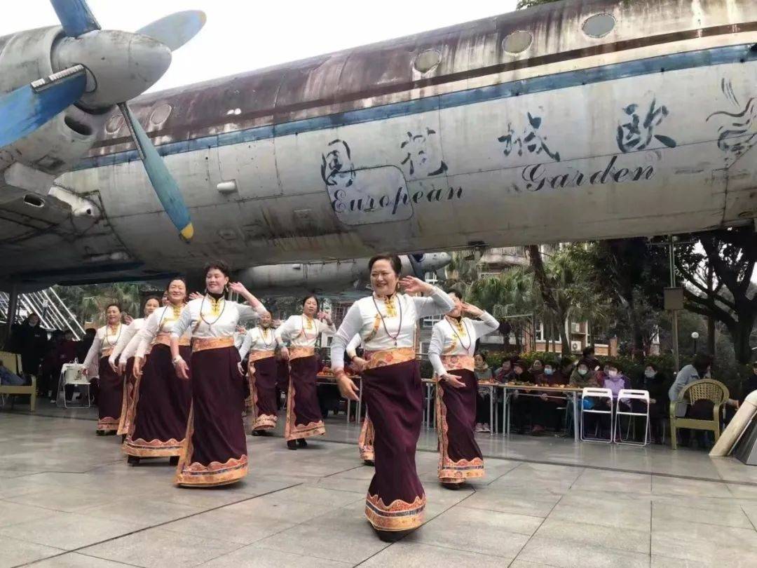 后来,藏舞经“民间舞团”和老年大学藏舞班两个传播节点而壮大。藏舞的形式和内容也随之改变。它不再是原汁原味的藏族民间舞蹈,而是融合了本地元素和时代特色的城市新舞蹈,舞姿里夹杂着现代舞和健身操的动作。参与者有藏族,也有汉族,着装也很自由。藏舞逐渐演变成双流各族居民共同参与的城市文化活动。