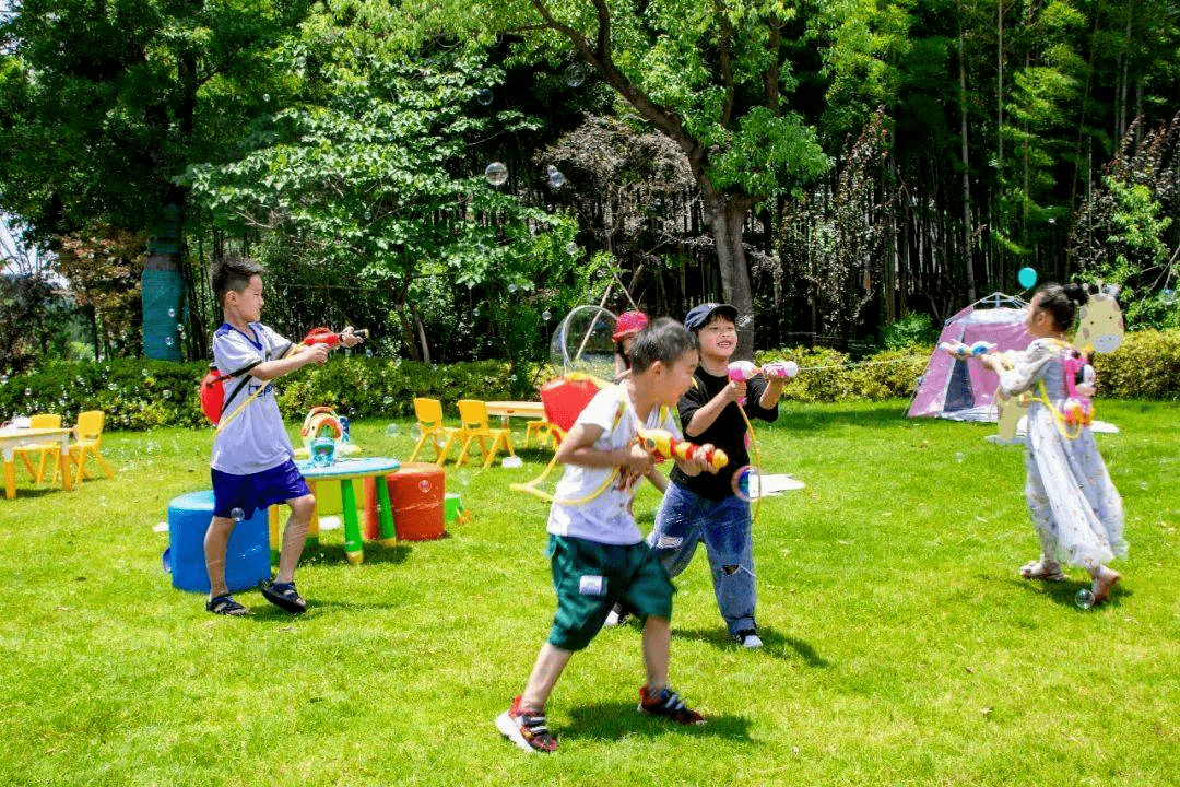 和孩子们在草坪上嬉戏