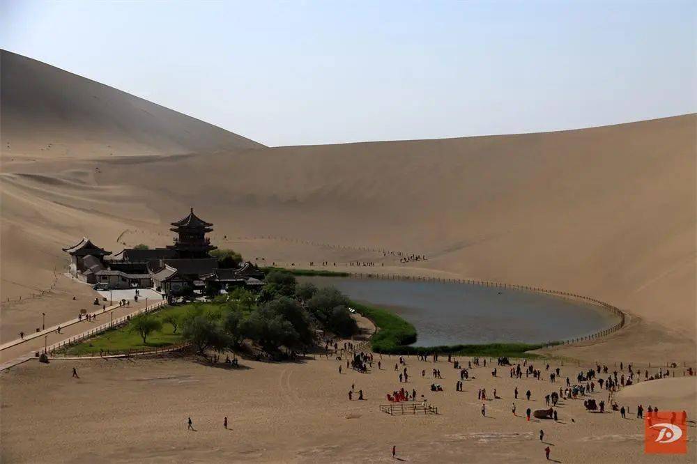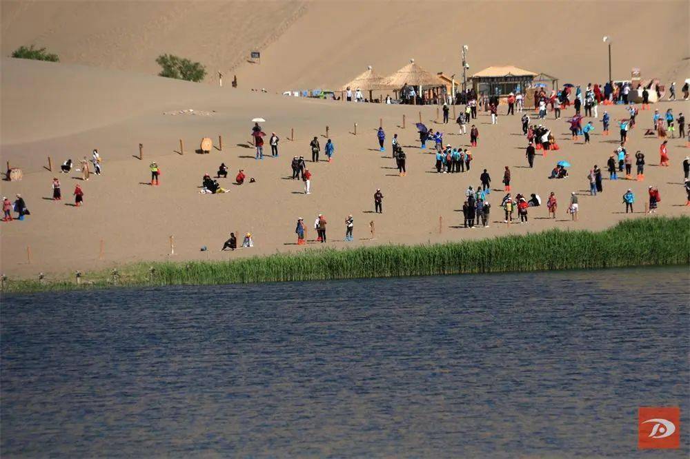 2023年5月11日,游客在敦煌市鸣沙山月牙泉景区游览。