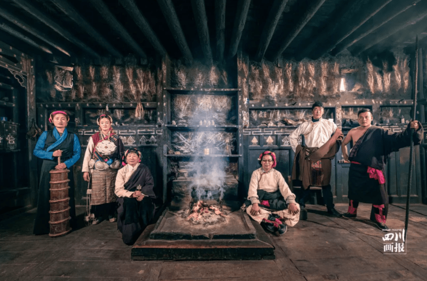 八玛平鲁一家身着木雅传统服饰和康巴藏装,在传统民居三层的客厅里合影