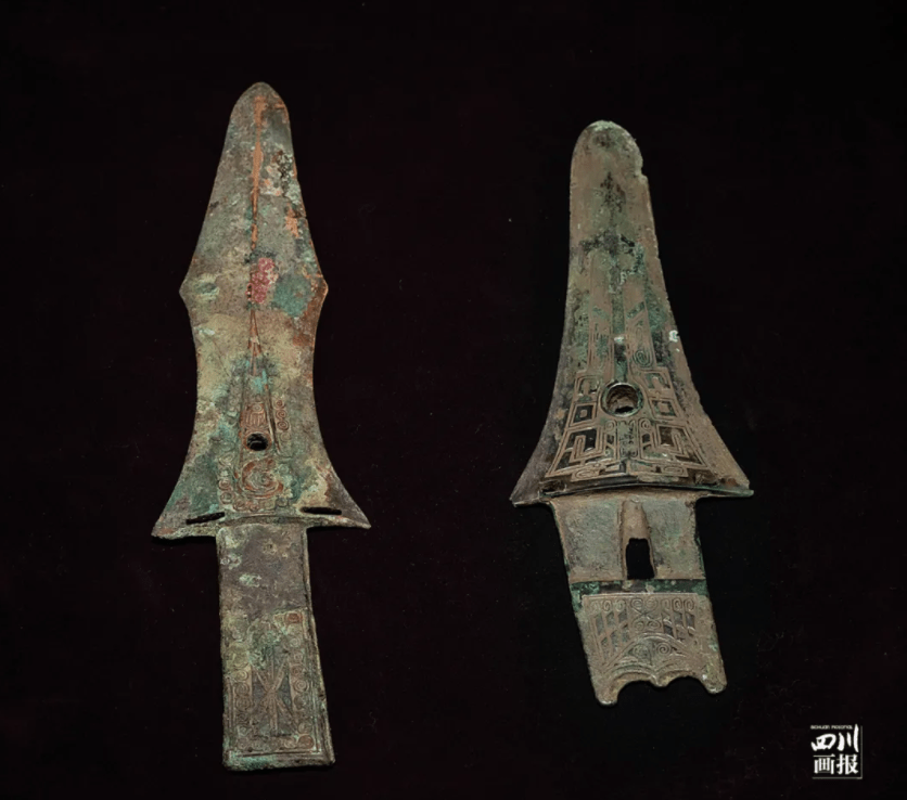 左为木雅地区西汉时期文物:曲刃铜戈。右为木雅地区战国时期文物:铜戈