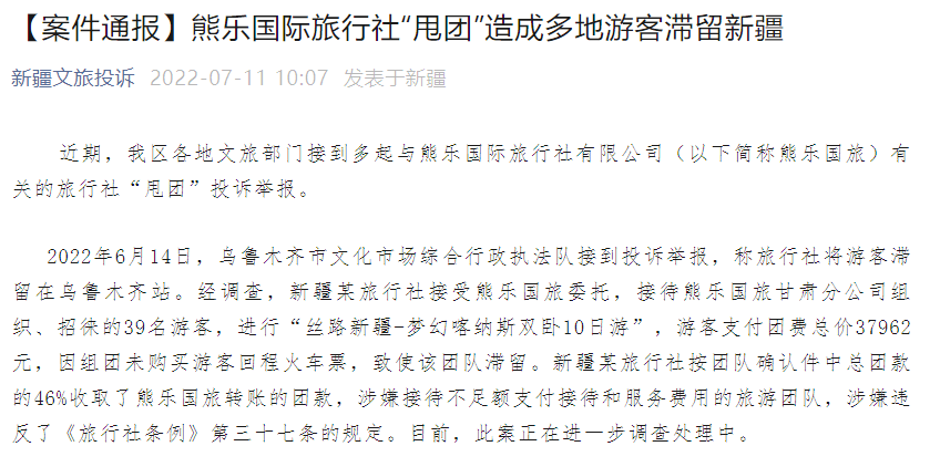 此前,2022年7月,据微信公众号“新疆文旅投诉”通报,熊乐国际旅行社“甩团”造成多地游客滞留新疆。通报称,近期,自治区各地文旅部门接到多起与熊乐国际旅行社有限公司有关的旅行社“用团”投诉举报。2022年6月14日,乌鲁木齐市文化市场综合行政执法队接到投诉举报,称旅行社将游客滞留在乌鲁木齐站。经调查,新疆某旅行社接受熊乐国旅委托,接待熊乐国旅甘肃分公司组织、招徕的39名游客,进行“丝路新疆-梦幻喀纳斯双卧10日游”,游客支付团费总价37962元, 因组团未购买游客回程火车票,致使该团队滞留。新疆某旅行社按团队确认件中总团款的46%收取了熊乐国旅转账的团款,涉嫌接待不足额支付接待和服务费用的旅游团队,涉嫌违反了《旅行社条例》第三十七条的规定。目前,此案正在进一步调查处理中。