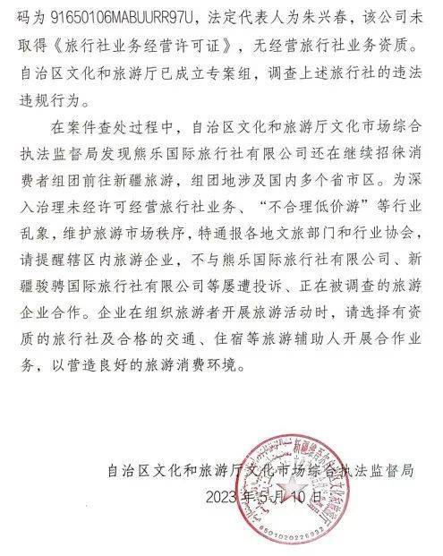 自治区文化和旅游厅文化市场综合执法监督局在上述通报中称, 在案件查处过程中,该局发现熊乐国际旅行社有限公司还在继续招徕消费者组团前往新疆旅游,组团地涉及国内多个省市区。为深入治理未经许可经营旅行社业务、“不合理低价游”等行业乱象,维护旅游市场秩序,特通报各地文旅部门和行业协会,请提醒辖区内旅游企业,不与熊乐国际旅行社有限公司、新疆骏骋国际旅行社有限公司等屡遭投诉、正在被调查的旅游企业合作。企业在组织旅游者开展旅游活动时,请选择有资质的旅行社及合格的交通、住宿等旅游辅助人开展合作业务,以营造良好的旅游消费环境。