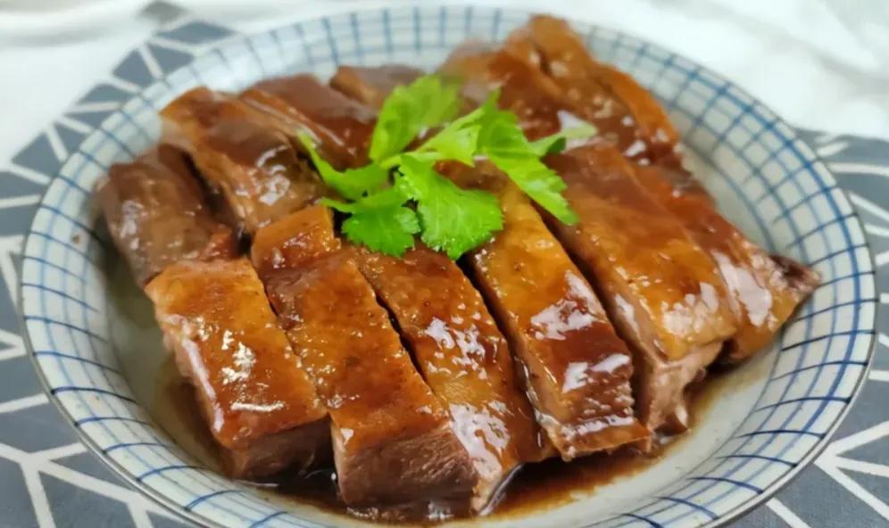 3、焖好把鹅拿出来,把汤里面的料头全部捞出,然后调大火收汁后调小火,把鹅放回锅里然后往鹅身上淋酱汁,颜色特别红亮,放凉之后斩成小块即可。