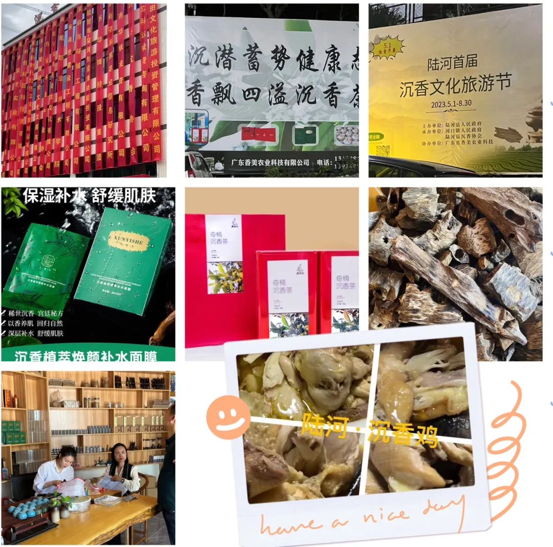 (沉香相关衍生品展销:沉香茶、深香酒、沉香面膜、沉香鸡等)