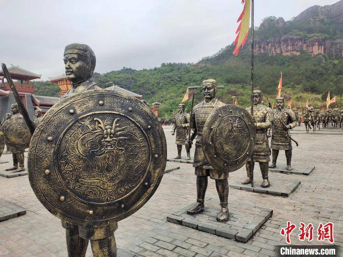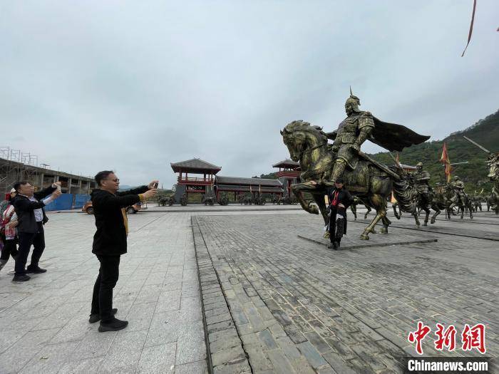雄伟的城楼前,南越王赵佗头戴盔甲,手握剑柄,骑着骏马,率领千军万马奔腾而来......进入广西铜石岭国际旅游度假区,壮观的塑像群映入眼帘。