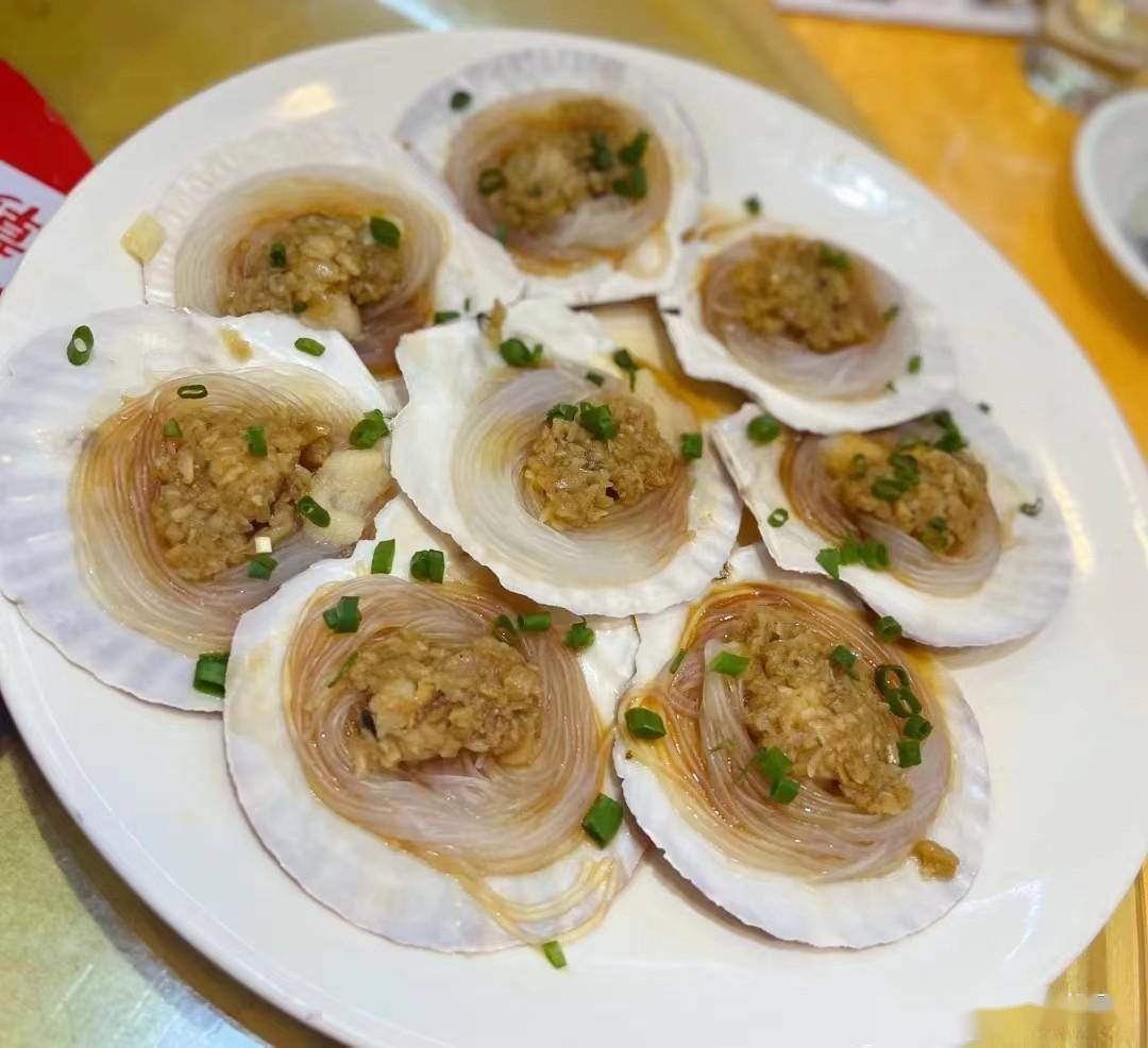 第六道菜是粉丝蒸扇贝,这道菜是最常见的一道海鲜菜肴,几乎全国各大餐馆里都会做,将扇贝肉清洗干净,然后放入少许龙口粉丝。