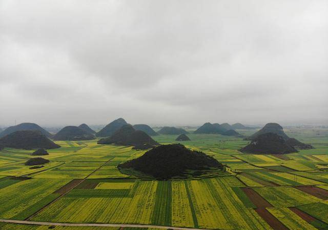 金鸡峰丛位于324国道边上,这里是典型的喀斯特地貌,一堆又一堆的山点缀在开满油菜花的地平线上,从高空看去,十分壮观。可惜我19年去的时候天气不是很好,而且在1月15号左右,景区的油菜花还没怎么开,不过当时能在1月中旬看到油菜花,心中也是极其开心的。