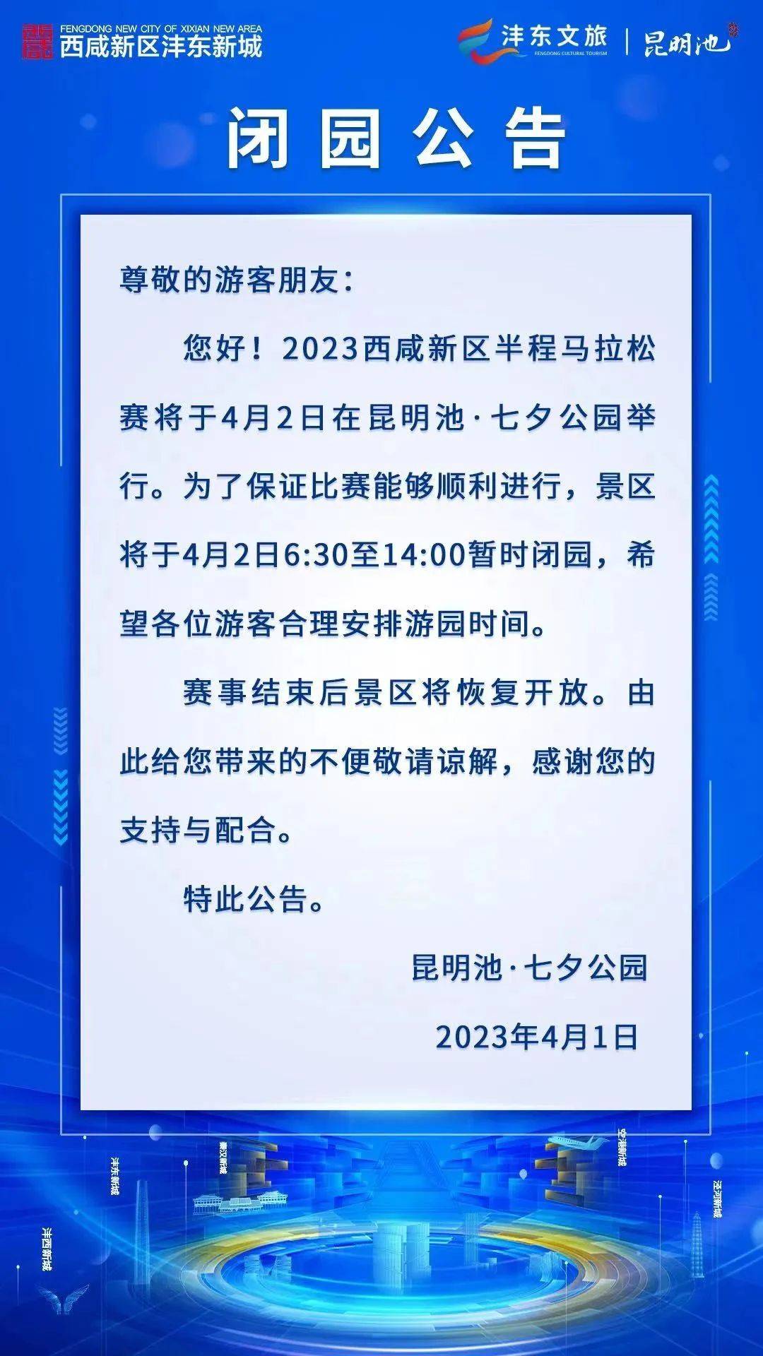 同时,据昆明池·七夕公园景区消息,为了保证比赛能够顺利进行,景区将于4月2日6:30至14:00暂时闭园,希望各位游客合理安排游园时间。赛事结束后景区将恢复开放。