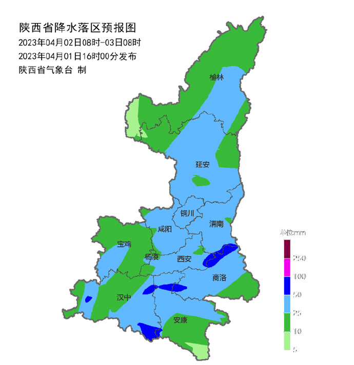 陕西省气象台2023年04月01日16时发布暴雨蓝色预警: