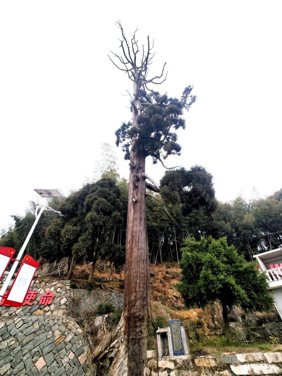 这株千年柳杉,相传为神仙所赐。闾山老母所赠扁担化作一大小两株柳杉树后,始祖敖一公便定居敖岭,开山造田,男耕女织,繁衍生息。柳杉也如夫妻般相依相伴,从半截扁担高的树苗,共同长成了参天大树。在一个风雨交加、电闪雷鸣的夜晚,一道闪电突然向柳杉劈来,妻子义无反顾地向雷电扑将过去,刹那间被烧戴焦炭,她用青春的身躯保存了丈夫的生命。一夜之间,丈夫树冠的绿叶落尽,焦黄皲裂的树皮显示着可挽回的衰老颓败。男儿有泪不轻弹,只缘未到伤心处。夜深人静,思念的泪水潸然而下。那晶莹的泪珠汇成了树下的一泓清泉。如今,这棵老树,如饱经沧桑的老人,伫立在村中、默默无语,却见证着人类对爱的坚守。