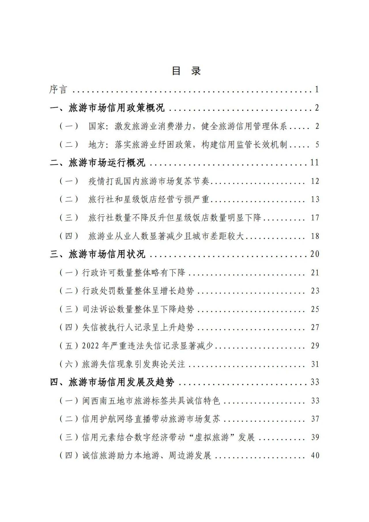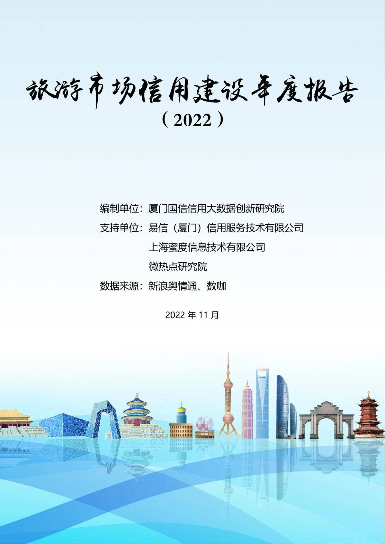随着市场经济发展和人民收入水平的提高,旅游业在国民经济中的地位和作用日益重要。基于此,厦门国信信用大数据创新研究院牵头编制《旅游市场信用建设年度报告(2022)》,内容涵盖全国重点城市及闽西南五市(厦门、漳州、泉州、龙岩、三明)旅游市场政策概况、运行概况、信用状况、旅游网络热点、新业态发展趋势及未来信用建设展望等方面,为政府主管部门对旅游业实施精准监管、培养旅游企业信用意识和加强旅游业信用管理提供参考借鉴。