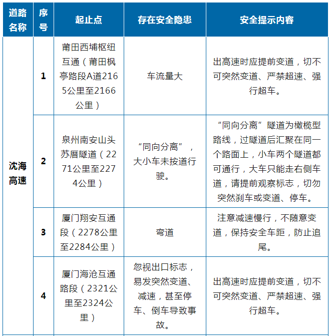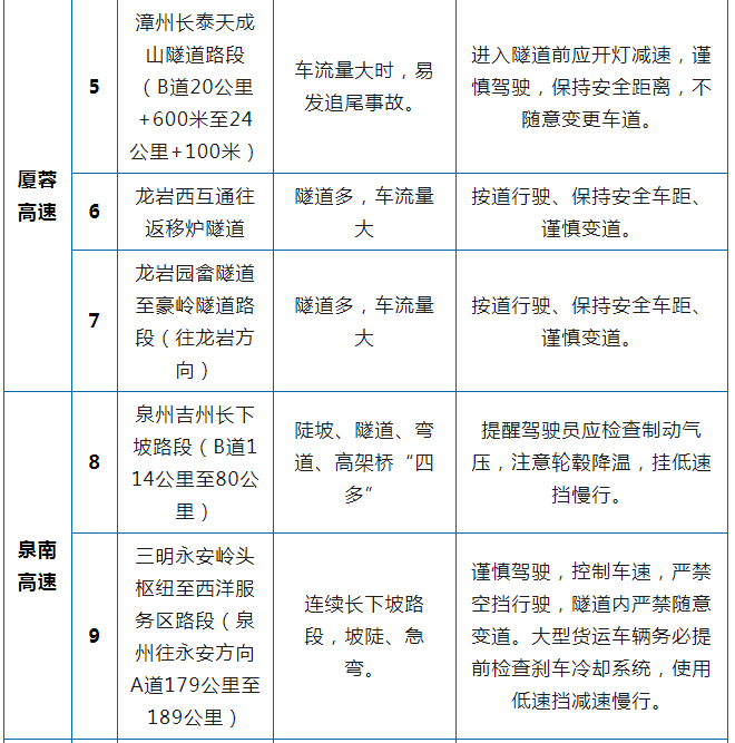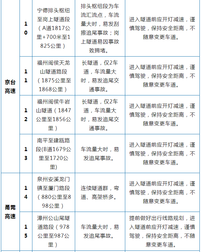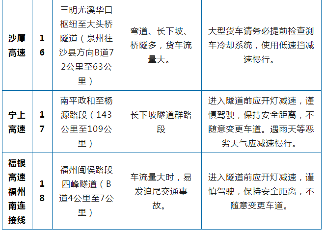 2023年清明假期福建省高速公路危险和事故易发点段(18个)