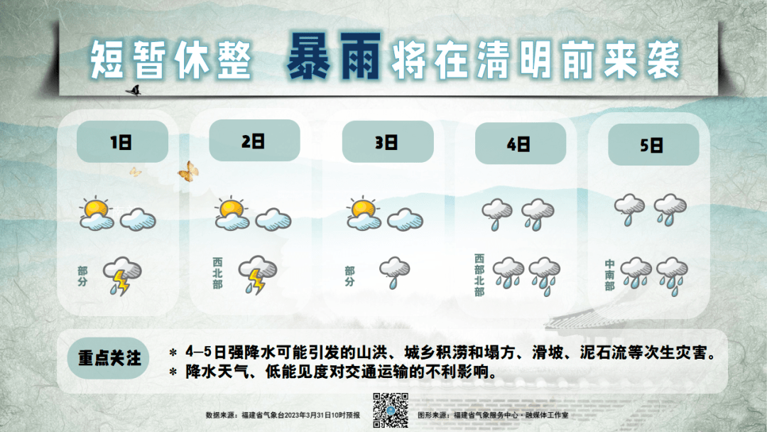 清明假期前后多阴雨。4-6日,全省阴有中阵雨或雷阵雨,部分地区大雨。其中,4日西部地区有暴雨,局部强降水可能对交通出行带来不利影响。