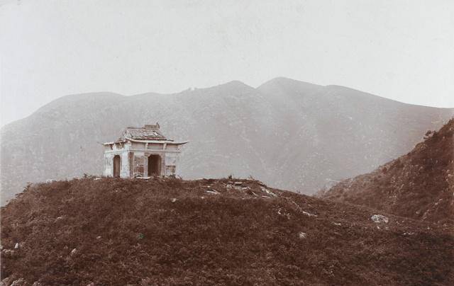 图中应该是一个外国人,站在牯岭的一处山崖边上,手持一把伞望向远方,后边是一个神龛,像这种神龛,一般为土地爷庙或是各类神仙的小居处。