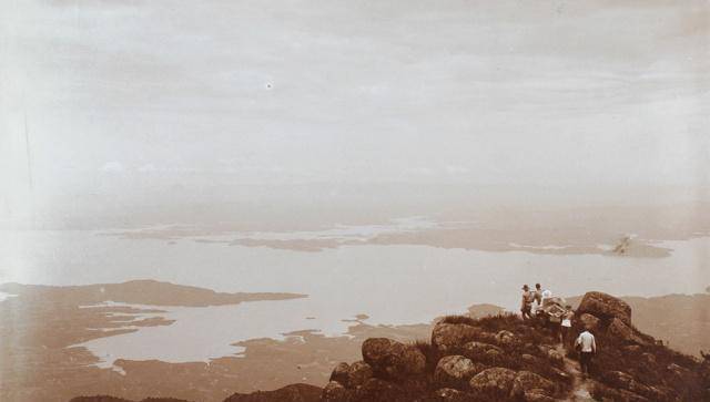 牯岭原是明代的禁山,在1886年时,英国传教士李德立上庐山,看中了这里的风景,在这里租住了下来,据记载,李德立在1895年从官府得到正式的租契。1904年又签订了推广租地合约,先后有20多个国家的传教士及各类人士在这里兴建别墅,1928年时别墅总数达到712栋,其中外国人的518栋,一直到1936年元旦,中国政府才正式接收回这一地区。图中是一名妇女,乘坐轿子行走的庐山之中,对面是潘阳湖。