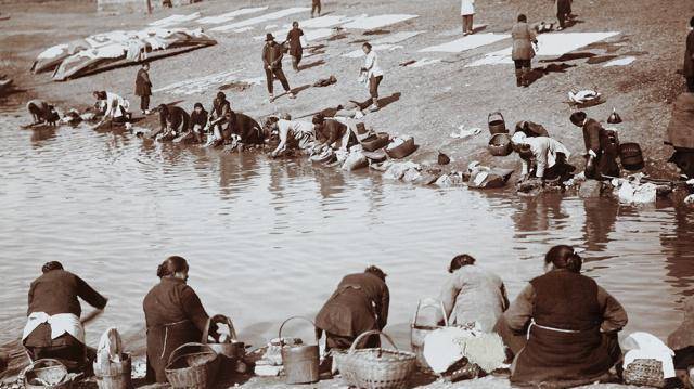 这是一个当时妇女们,洗衣物时的景象,所处地点不太确定,和作者其它照片一块,很可能是庐山附近的城镇,图中人们聚集在河边,用传统的捶打方法,进行衣物的清理活动。
