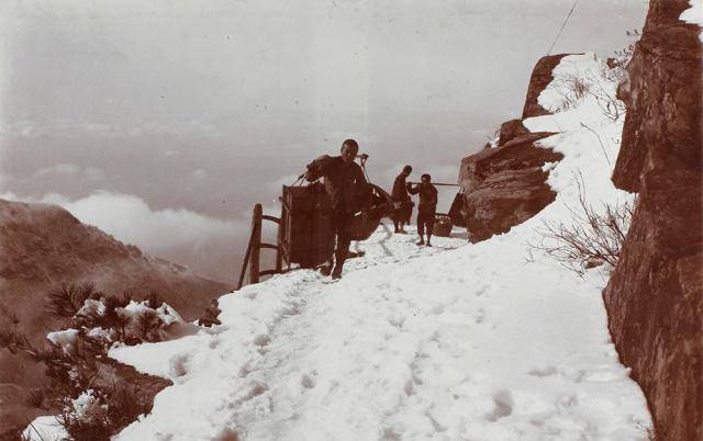 这是一张庐山地区的工人们,正在挑着货物,运送到山中去。下过雪的庐山风景精美,道路上还铺着厚厚的积雪,人们顺着前人走过的路线,缓缓而行,山边还留有枯木。工人们尽可能多的带些货物。