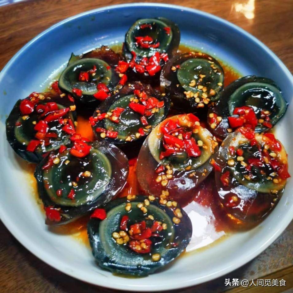 湖南人爱吃辣,一个凉拌皮蛋就做出了红艳艳的样子,看着就诱人,皮蛋一分为二,淋上酱油和红辣酱,这是张妈妈自己腌制的辣椒酱,用的是小米辣制作而成,鲜辣中带着一点酸甜口感,吃起来很开胃。