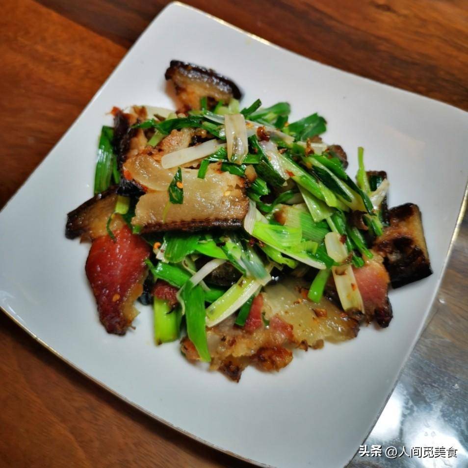 还有一道炒腊肉,当地人爱吃腊肉,腊月里自己做的腊肉看着黑黢黢其实肉质不咸不淡,口感特别好,猪皮黑而有韧,肥肉丰盈而多油脂,瘦肉红亮诱人,丝丝入味,比牛肉干还好吃,搭配蒜苗和一点豆豉,吃起来就特别香,不需要加盐,就是腊肉本身的味道就够了。