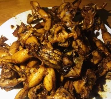 比起来,火爆田鸡的口感,更加干酥,干香,蛙肉煸得恰到好处,再好的干煸鸡在它面前都是逊色的。