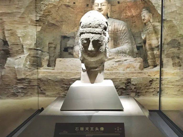 云冈石窟石雕天王头像,为美籍华裔王纯杰夫妇捐赠。这尊北魏时期的石雕天王头像雕刻精细,面相椭圆,眉眼细长,鼻高直,嘴角微翘,面含笑意,时代特征鲜明,代表了北魏皇家洞窟造像高超的艺术水平。
