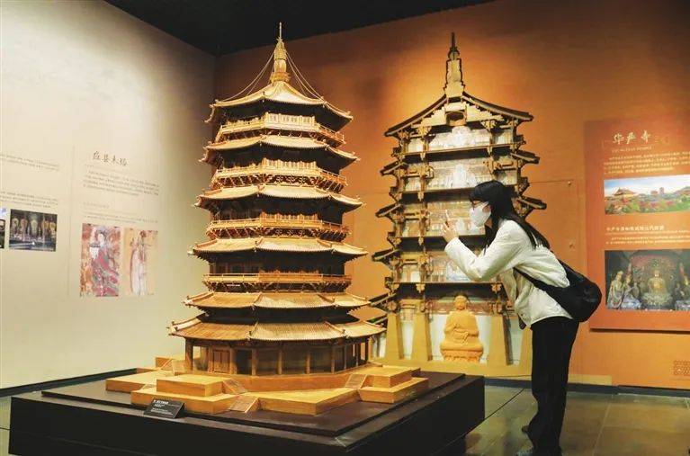 “土木华章”展区,把山西古建筑和古建内的附属文物进行整体融合,展陈顺序以年代划分。天峰坪遗址距今4800年的门轴石,让观众看到古人的建筑风格。北朝时期的九原岗壁画中的门楼图,呈现了北朝的建筑特色。以佛光寺为“聚点”,唐五代时期山西现存的7座建筑都有亮相,扩充参观体验感。