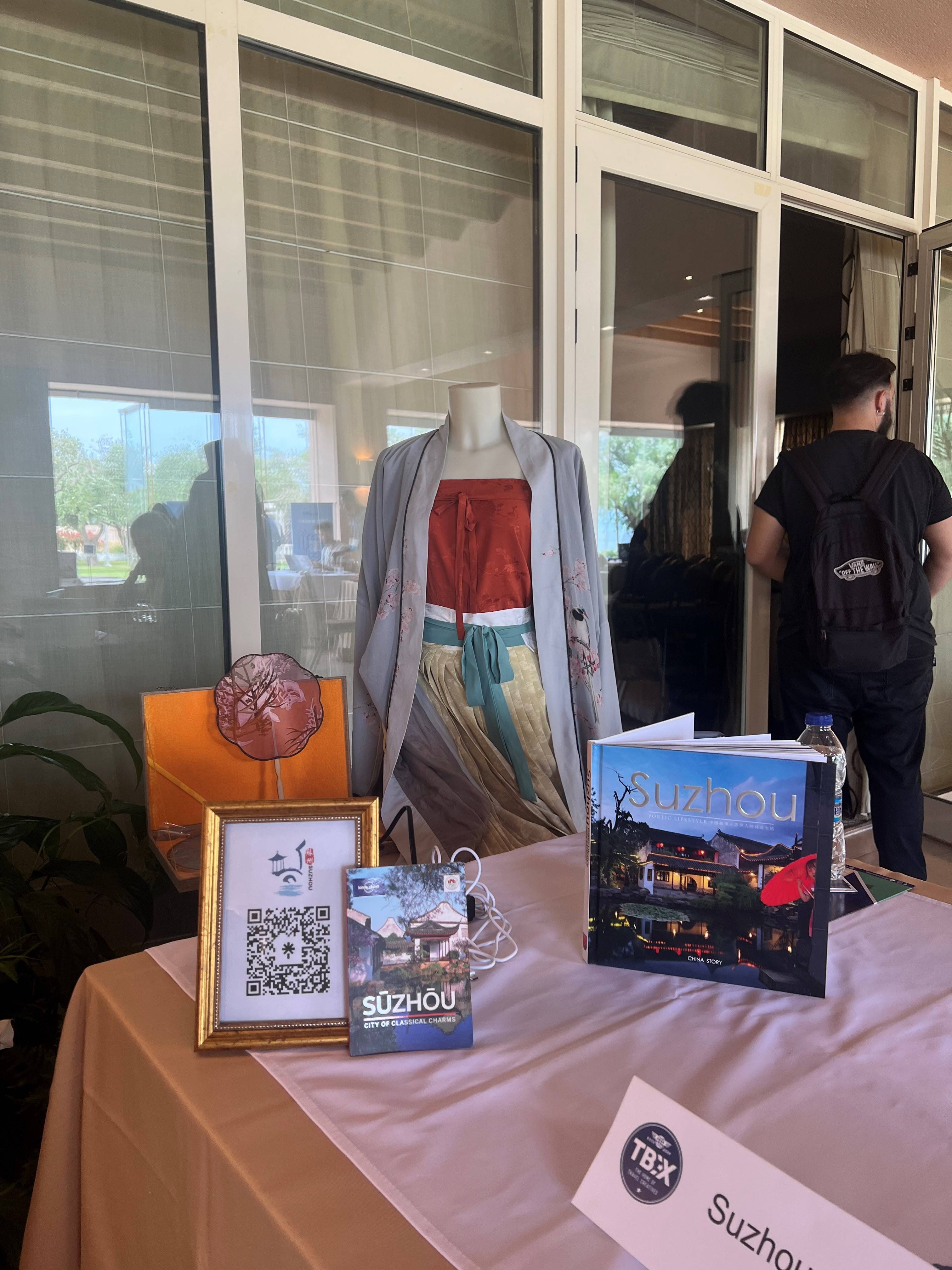 作为苏州传统文化传承体验的一部分,苏州市文化广电和旅游局与苏州丝绸博物馆和当地中希华人戏剧联盟SHPAA合作,通过宋朝汉服演绎、古筝扬琴等传统乐器演奏以及融入了传统苏州评弹《声声慢》的当代《江南芭蕾》舞蹈表演,为所有参会嘉宾带来穿越式的中国传统文化体验。其中,由苏州丝绸博物馆策划的汉服展示,用“春夏秋冬”四套精致的宋朝汉服诠释苏州历史文化与江南文化的完美融合。苏州市文化广电和旅游局在展会现场设有专属展台。展台旁陈列的汉服吸引了现场众多嘉宾的关注。苏州市文化广电和旅游局的现场代表也借此机会为前来展台的旅游达人和作者,一对一详细介绍苏州及其丝绸历史、制丝、苏绣等苏州文化和旅游资源。来到苏州展台的嘉宾还可以通过扫描二维码,访问苏州市文化广电和旅游局官方英文网站www.TraveltoSuzhou.com 浏览TBEX 苏州专属手册,了解更多有关苏州丝绸、宋锦、苏州丝绸博物馆及更多苏州文化和旅游信息。苏州的丝绸文化和来自苏州的东方之美成为此次TBEX峰会最受欢迎的话题之一。