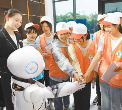 “数游峨眉”体验中心,参加研学的学生与智能讲解机器人互动。
