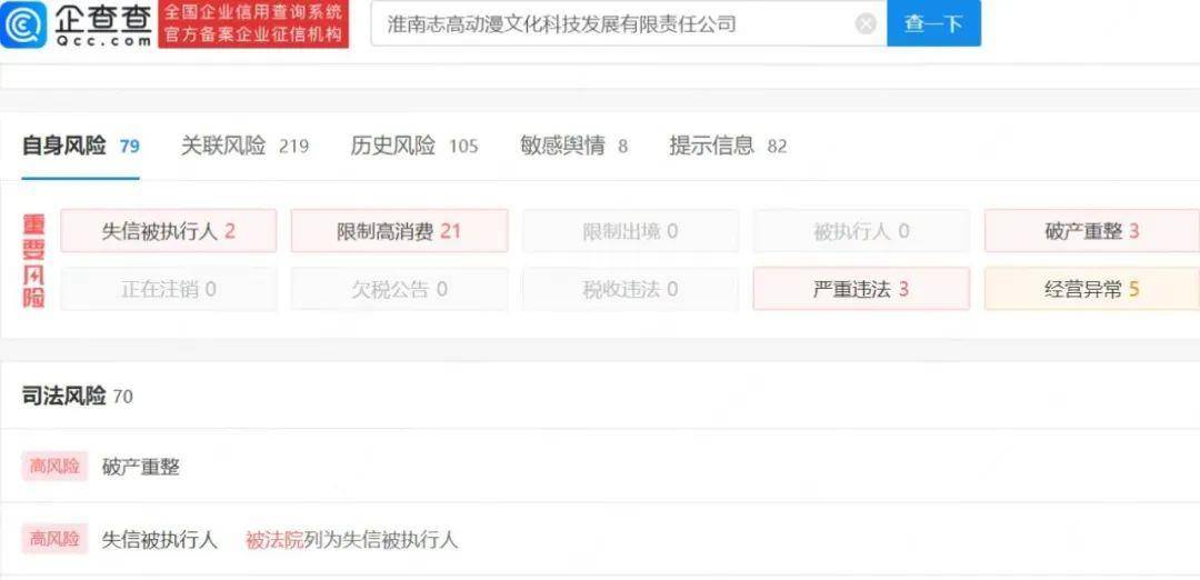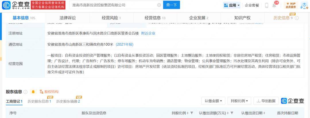 企查查APP显示,淮南志高文化科技动漫产业园关联主体公司为淮南志高动漫文化科技发展有限责任公司,成立于2010年,注册资本8000万元,法定代表人为江焕溢,股东包括泰安志高实业集团有限责任公司、安徽润龙商务信息咨询有限公司、淮南市城市建设投资有限责任公司、姚竣豪,分别持股61%、15%、15%、9%。
