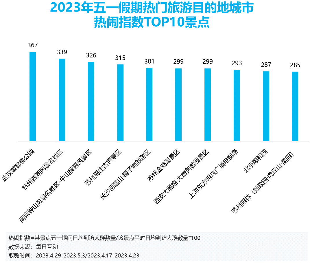 每日互动大数据通过将不同景点五一期间到访人群数量与日常到访人群数量进行对比,发现今年的长假出行,人们偏爱人文景点胜过自然景观。武汉的黄鹤楼、南京的中山陵、西安的大雁塔、北京的颐和园、以及上海的东方明珠广播电视塔、苏州的金鸡湖等都榜上有名。从古至今,从历史剪影到现代商业,游客们这个假期在古今穿梭间感受到祖国的繁荣。