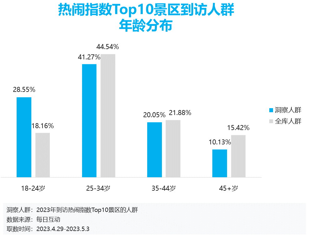 同时,每日互动大数据发现,此次五一假期的出行人群中,18-34岁的年轻人群占比突出。其中18-24岁人群相较于该年龄段全量人群来讲尤其偏爱以上热闹景区,25-34岁的人群紧随其后。