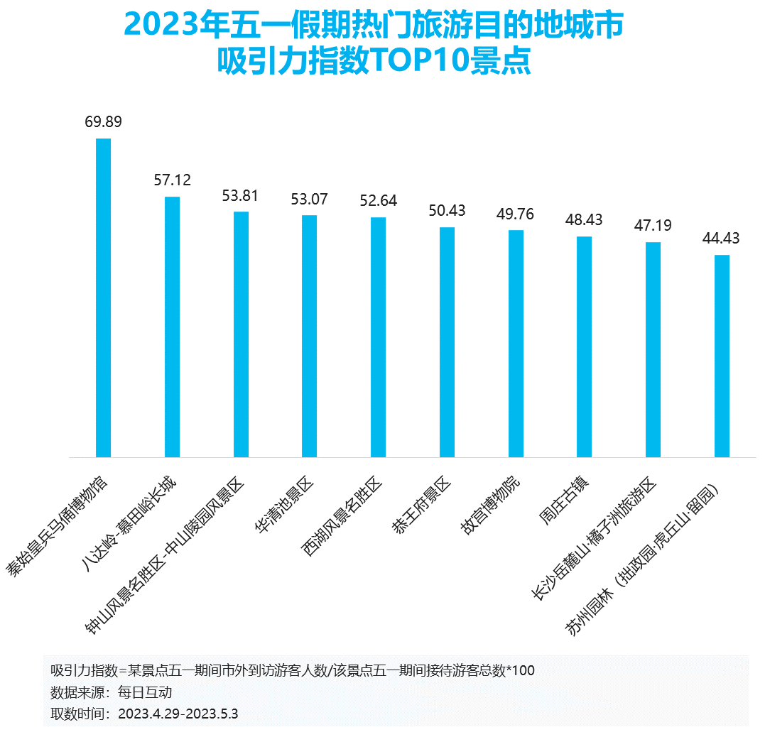 每日互动大数据显示,在观测城市所覆盖的众多5A景点中,对外地人群吸引力最强的前十名景区分别是西安市秦始皇兵马俑博物馆、北京八达岭-慕田峪长城旅游区、南京市钟山风景名胜区-中山陵园风景区、西安市华清池景区、杭州市西湖风景名胜区、恭王府景区、故宫博物院、苏州市周庄古镇景区、长沙市岳麓山·橘子洲旅游区、苏州园林。其中首都北京作为全国人民的精神向往,在最受外地人欢迎的TOP10 5A景点排行中占据三个席位。此外, 五一期间正值暮春好时光,苏州园林及周庄古镇也以特有的江南风情上榜,成为人们的心灵故乡。