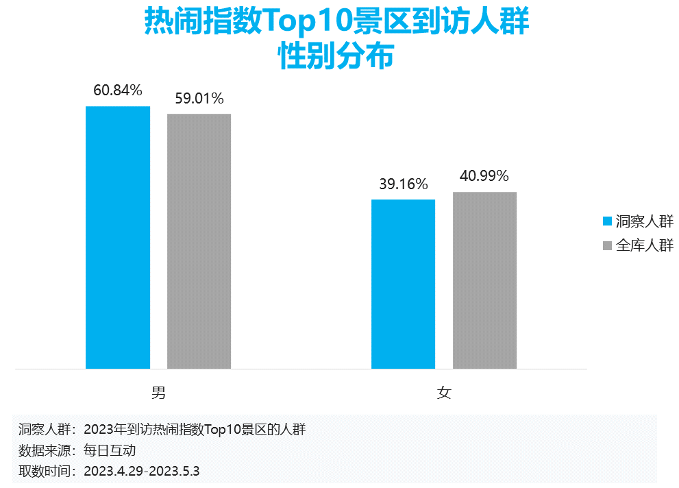 每日互动大数据对此次热闹指数排名Top10景区的到访人群进行洞察发现,在以上比较热闹的景点中,男性人群的占比要高于女性人群。