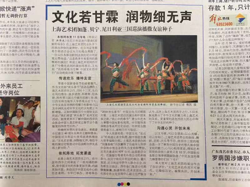 此后,上海艺术团又先后在贝宁的波多诺伏、科特努、尼日利亚的拉各斯、阿布贾等五个西非城市巡演了七场,观众近万人次。我以特派记者身份在解放日报刊发了题为《文化若甘霖 润物细无声》的新闻综述,详细记述了上海艺术团如何以文化为媒,在中国和西非之间架起了一座沟通的桥梁。新闻标题来自时任中国驻尼日利亚大使邓清波的一番话:“文化若甘霖,润物细无声。文化艺术的作用不可替代,它凝结历史,凝聚共识,开创未来。相信上海艺术团今晚的演出一定能推动中尼战略伙伴关系再上新台阶。”