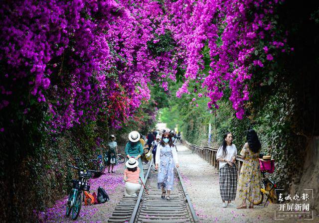 顺着米轨一侧,延绵的三角梅花似是一眼看不到头,人们纷至沓来,寻找光阴的故事。三角梅花瀑让这段铁路焕发生机,成为了一种连接,连接着从前,盛放了现在。