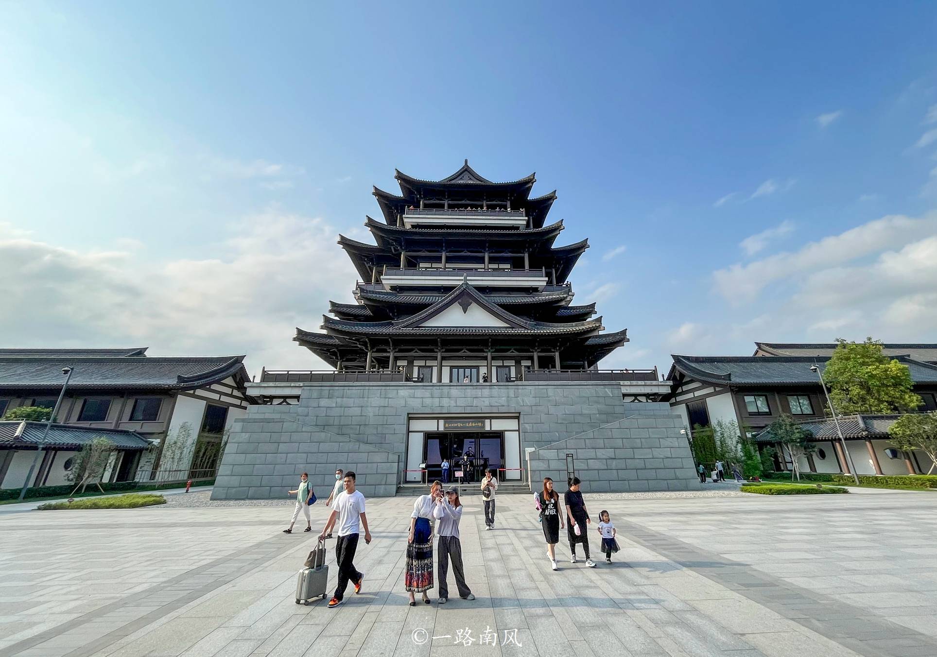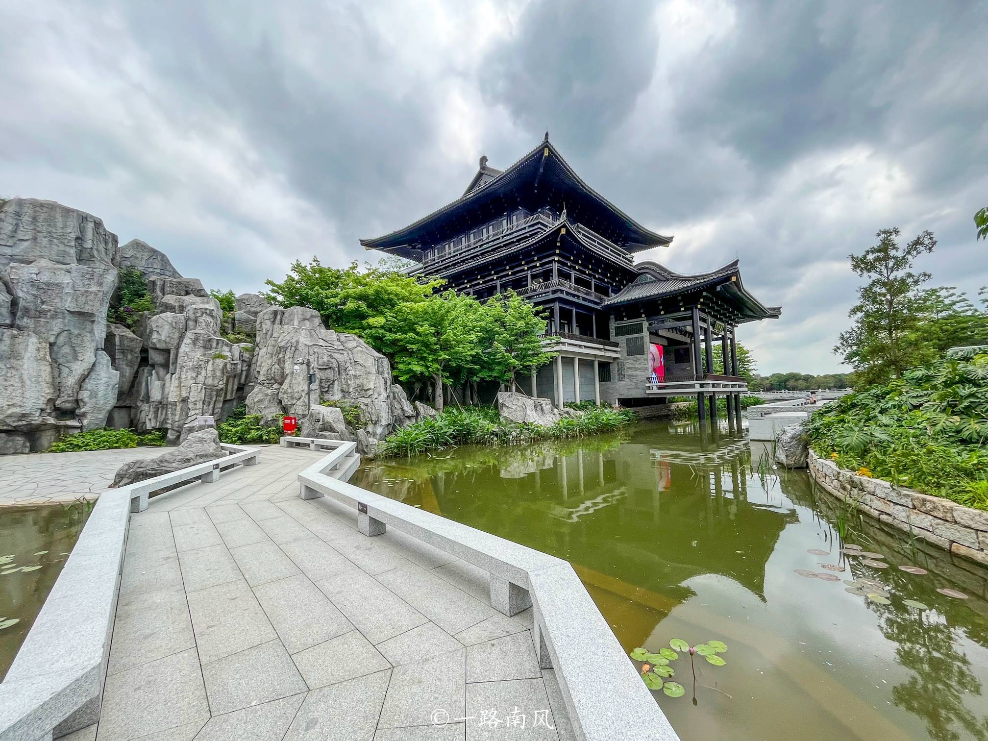 这是一栋三层高的阁楼,风格和尺度比例学习了汉唐“如鸟斯革,如翚斯飞”的气韵,在二楼的美人靠上静坐、吹风、看景,感觉特别惬意。