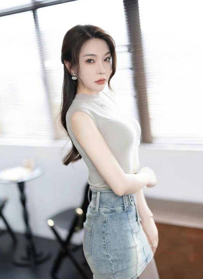 上身穿着无袖针织衫,下身超短牛仔裤,脚踩白色高跟鞋,留着长发。