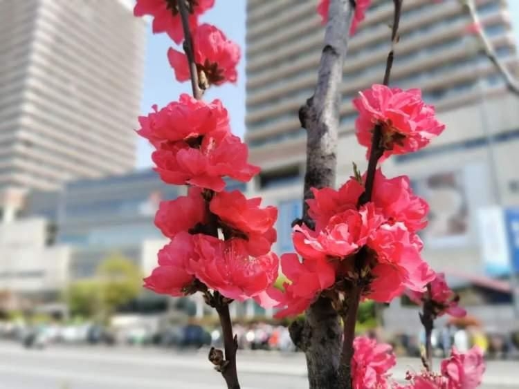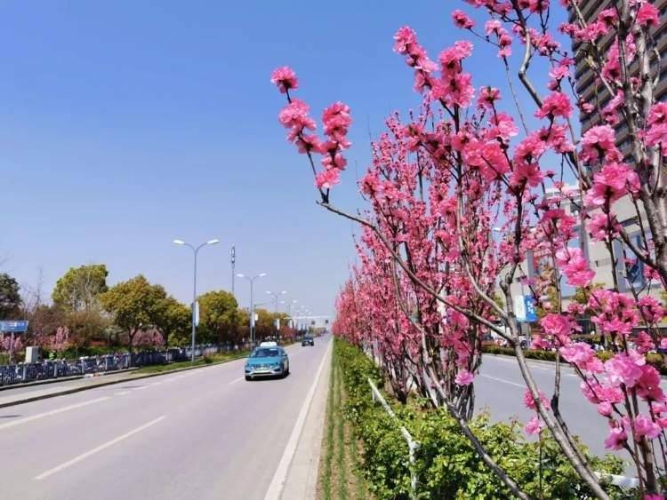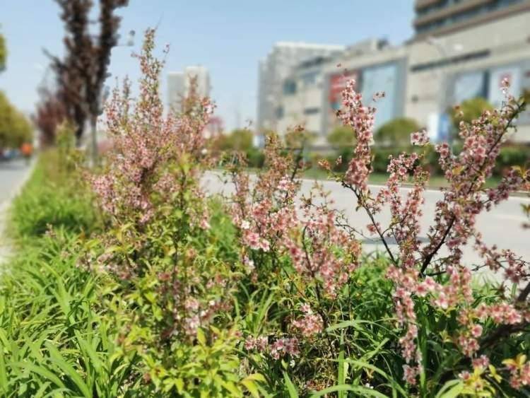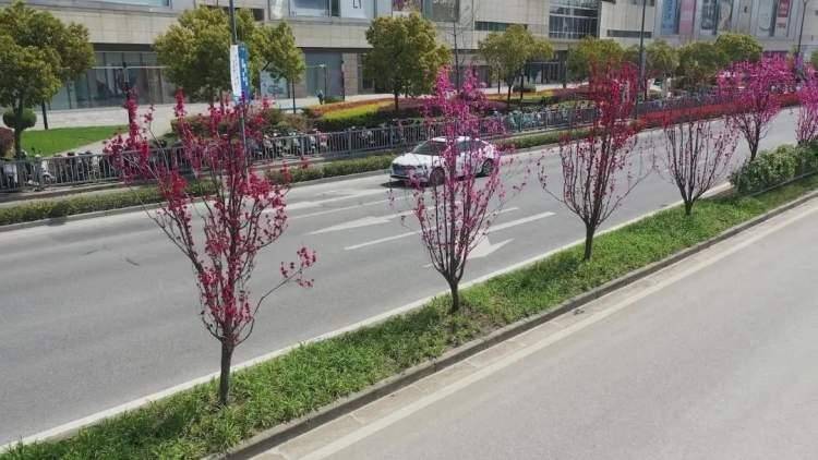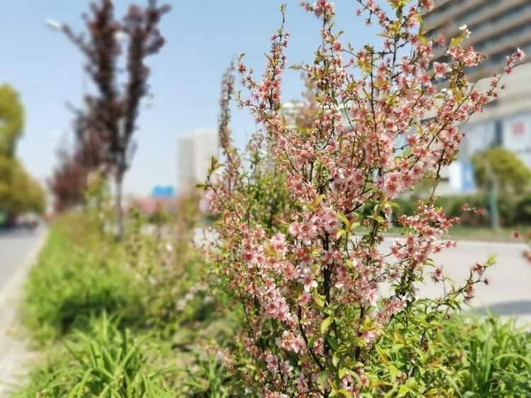 在陆翔路的隔离带和道路两侧绿化带中,这种盛开着粉红色或枣红色花朵的观赏植物就是帚桃,它们成排成行,将隔离带装扮成了美轮美奂的“风景区”。陆翔路两侧绿化带中的帚桃则装点在高大葱茏的树木中间,与樱花、垂丝海棠等开花植物相得益彰。