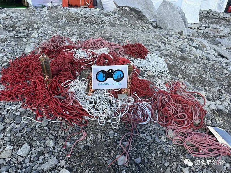 想象尼泊尔奉行保持山区清洁的理念,我们相信我们所做的每一点小努力都会对山区环境产生重大影响。上图为我们修路队在第一阶段和第二阶段铺路工作时收集的旧路绳和氧气瓶。从顶峰返回后,我们团队将继续从南坳及以上区域收集更多废弃品。
