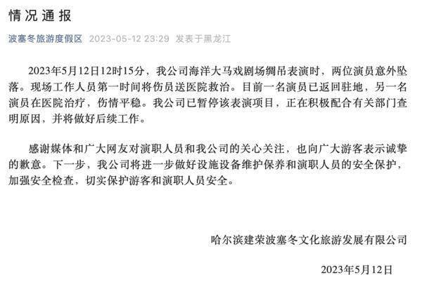 哈尔滨建荣波塞冬文化旅游发展有限公司5月12日晚发布情况通报:2023年5月12日12时15分,我公司海洋大马戏剧场绸吊表演时,两位演员意外坠落。现场工作人员第一时间将伤员送医院救治。目前一名演员已返回驻地,另一名演员在医院治疗,伤情平稳。我公司已暂停该表演项目,正在积极配合有关部门查明原因,并将做好后续工作。