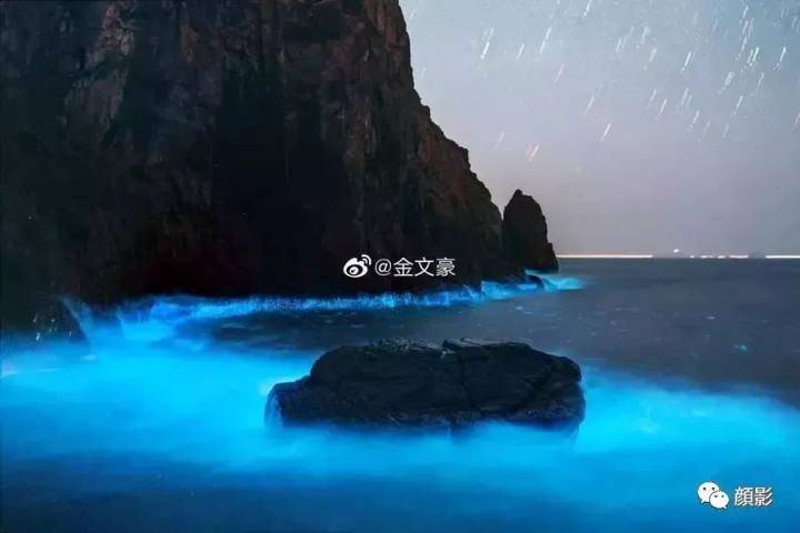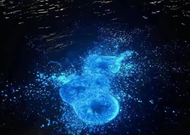 暗夜中,随着波浪,蓝光在海面上发散开来,仿佛满天星光散落在海浪里。