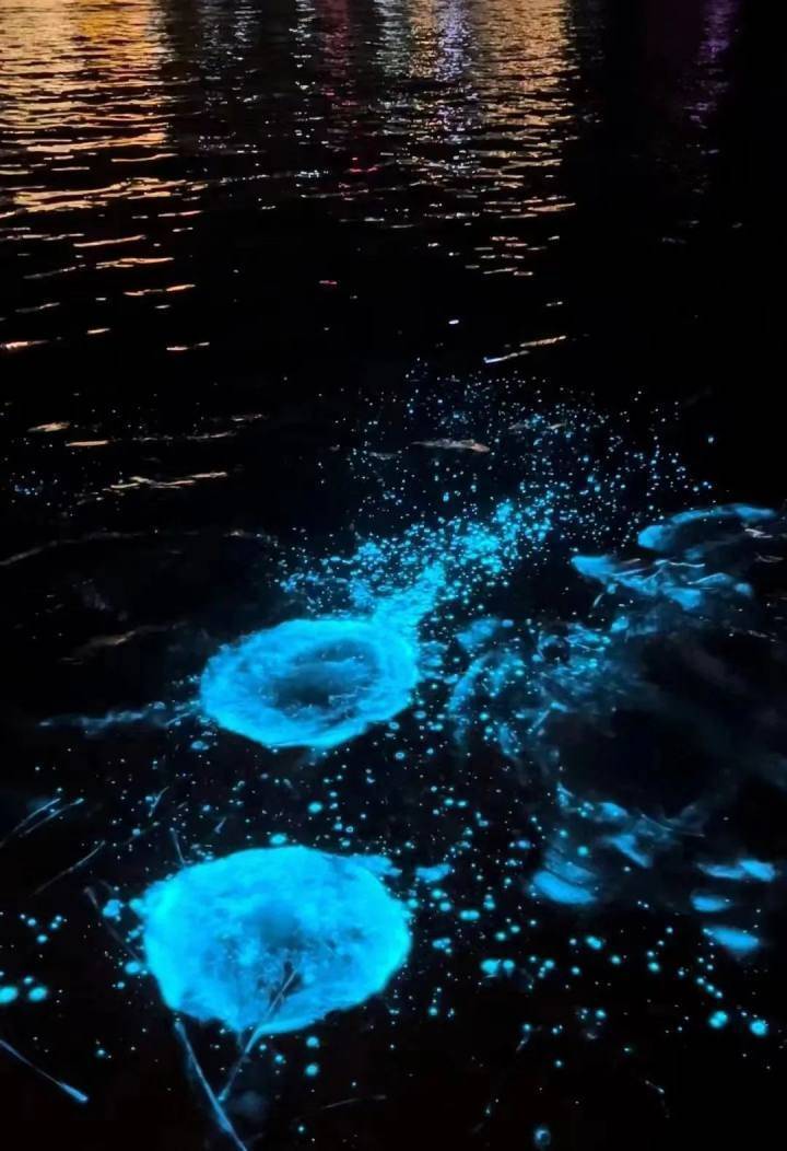 夜光藻之所以会发光,是因为细胞内具有荧光素和荧光素酶,在受到外界扰动时会发生反应并放出蓝色荧光。