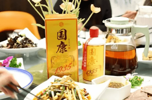 吃到这里,申老头觉得差点滋味。前面两个菜都是肉菜,这让酒龄深厚的申老头觉得,不配点酒,简直是可惜。左右看看发现桌周围的人都在喝一款黄瓶包装的酒水,就叫来服务员要了一瓶一样的酒水。这时候才看见,这是一款叫做国康1935的酱香酒水。